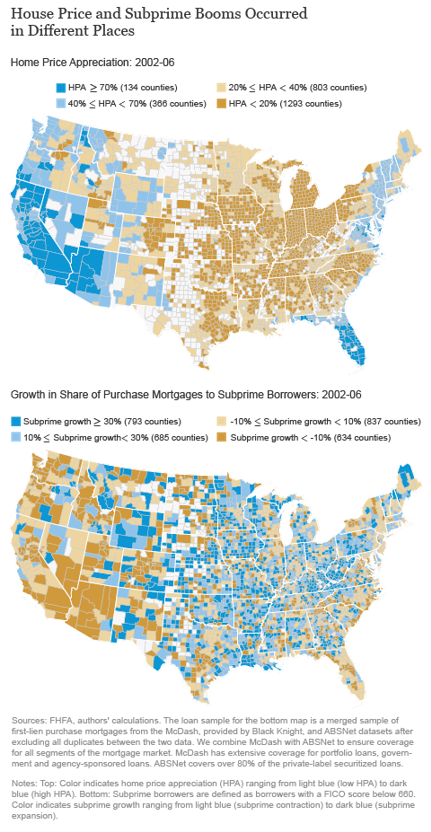 They also demonstrate that the boom in house prices and sub-prime mortgage loans occurred in different places (see the maps below). They show a clear negative correlation between house price appreciation and the sub-prime share of home purchase mortgages.